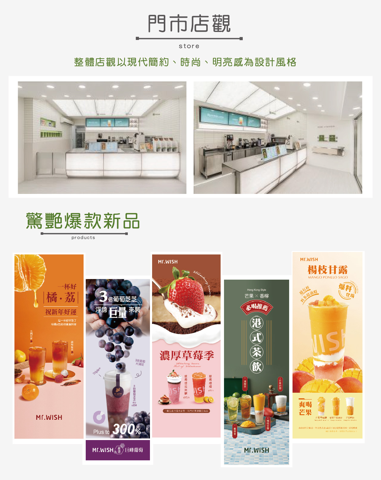 Mr.WISH 以「希望好茶」 在飲品上不斷探索, 順應著消費者需求和時代的變化, 品牌也進行了全方位的升級, 將Mr.WISH 希望好茶提升為職人等級 秉持「有好茶,才有好果茶」 並保持原有且加上新價值, 展露WISH十年經驗優勢創造出的核心。